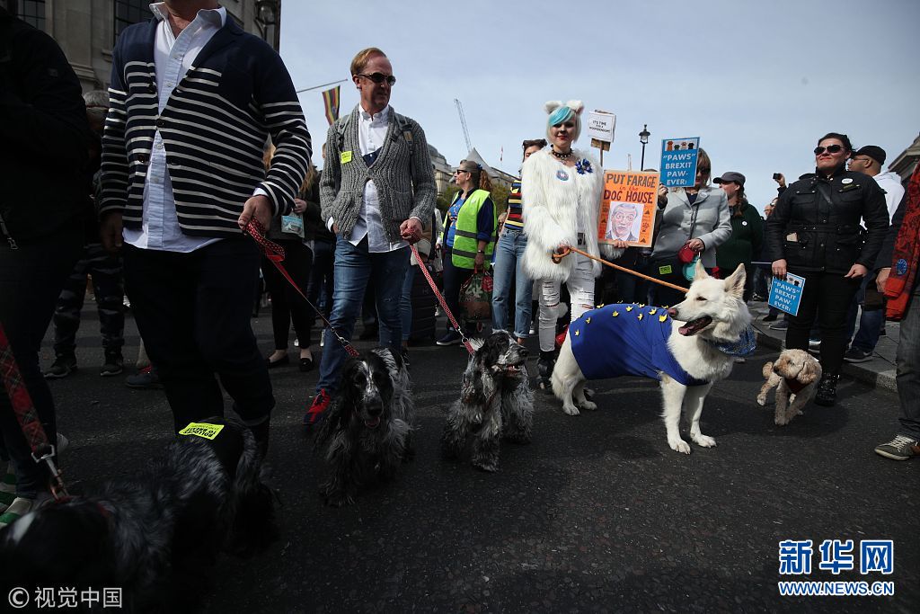 民众带领他们的宠物在市中心游行,抗议英国脱离欧盟。(图片来源:视觉中国)