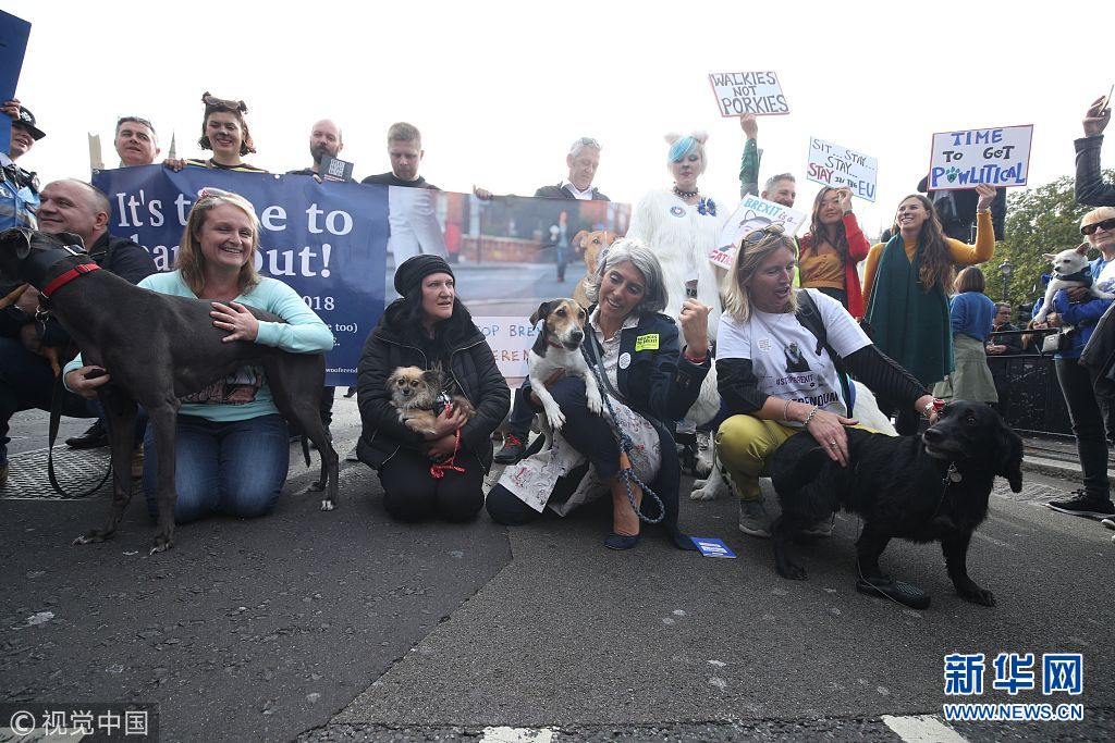 当地时间2018年10月7日,英国伦敦,当地反脱欧民众带领他们的宠物在市中心游行,抗议英国脱离欧盟。(图片来源:视觉中国)