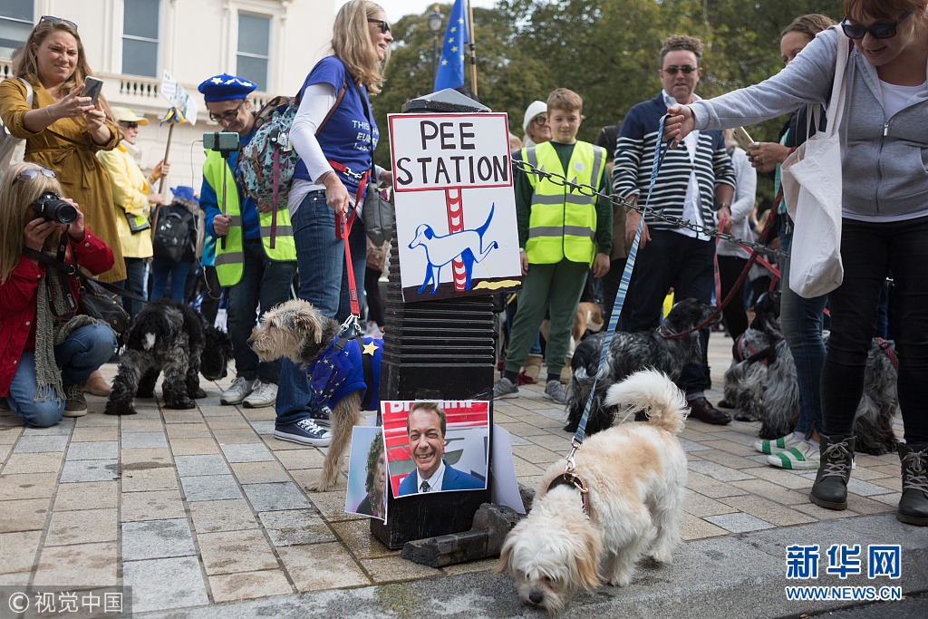 当地时间2018年10月7日,英国伦敦,当地反脱欧民众带领他们的宠物在市中心游行,抗议英国脱离欧盟。(图片来源:视觉中国)