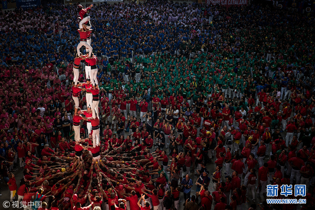 当地时间2018年10月6日,西班牙塔拉戈纳举行搭人塔比赛。搭人塔是加泰罗尼亚地区的传统节日庆祝活动。(图片来源:视觉中国)