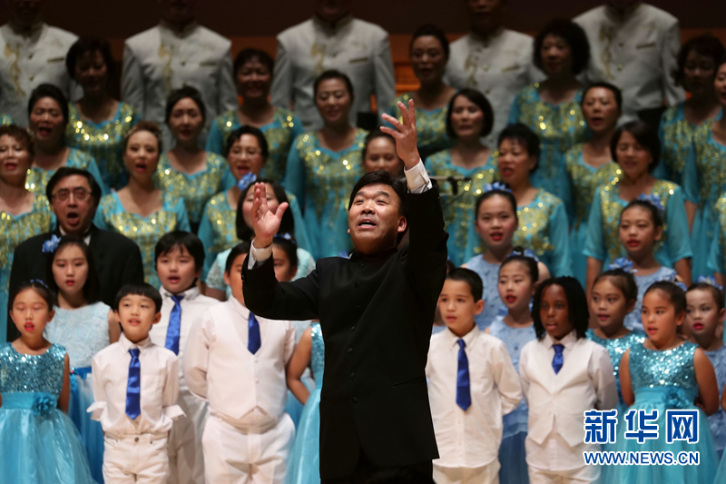 10月7日,在美国芝加哥,知名华人指挥家乔万钧在音乐会现场带领合唱团演绎王立平经典作品。新华社记者 汪平摄
