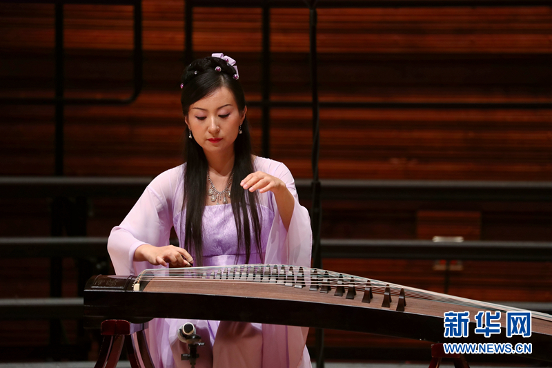 10月7日,在美国芝加哥,古筝演奏家关孟华在音乐会现场弹奏《晴雯歌》和《聪明累》。新华社记者 汪平摄