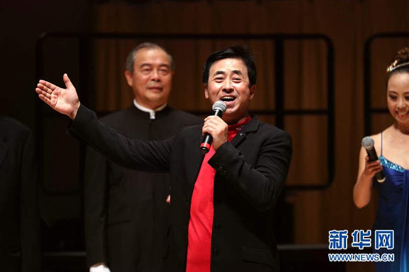 10月7日,在美国芝加哥,当地知名音乐人武航建在音乐会现场演唱《浪花里飞出欢乐的歌》。新华社记者 汪平摄