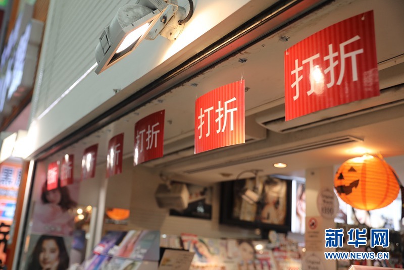 这是10月6日在日本大阪拍摄的一家挂满中文“打折”字样的商铺。 新华社记者 杜潇逸 摄
