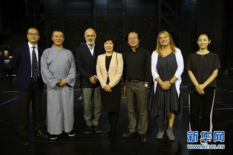 10月4日,在希腊国家剧院,中国驻希腊大使章启月(中)、中国导演王晓鹰(右三)、希腊导演利瓦色诺斯(左三)等与《赵氏孤儿》主演合影。新华网发 马里奥斯·罗洛斯摄