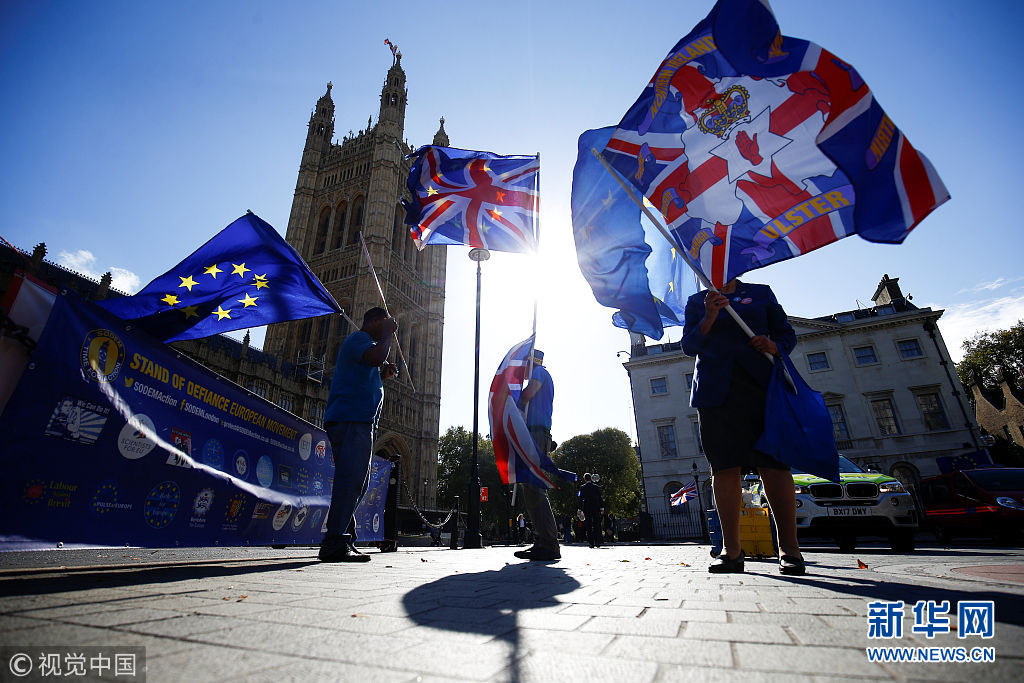 当地时间2018年10月11日,英国伦敦,英国民众在议会大厦前举旗反对“脱欧”。(图片来源:视觉中国)