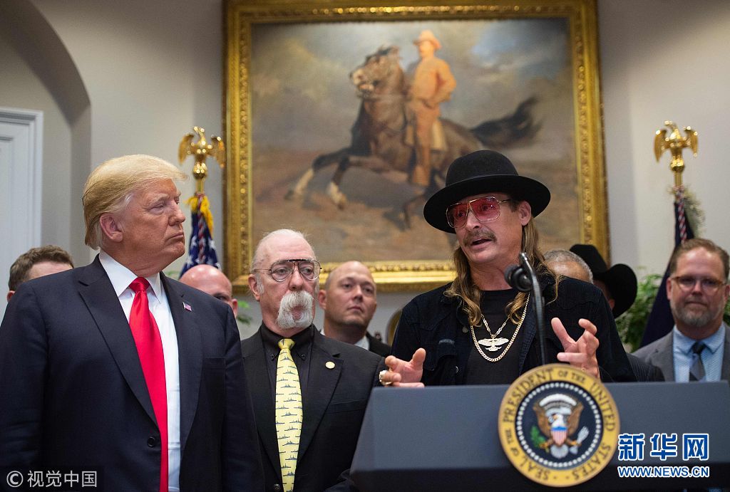 当地时间2018年10月11日,美国华盛顿,美国总统特朗普签署Hatch-Goodlatte音乐现代化法案,该法案旨在确保艺术家在1972年之前发布的专辑从数字服务获得版税,多名音乐人出席仪式。(图片来源:视觉中国)