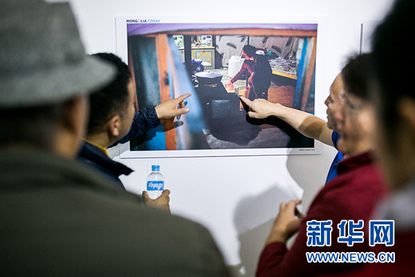 10月14日,在蒙古国首都乌兰巴托,人们观看“今日蒙古国”国际摄影采风活动作品展。新华社记者 白雪骐 摄