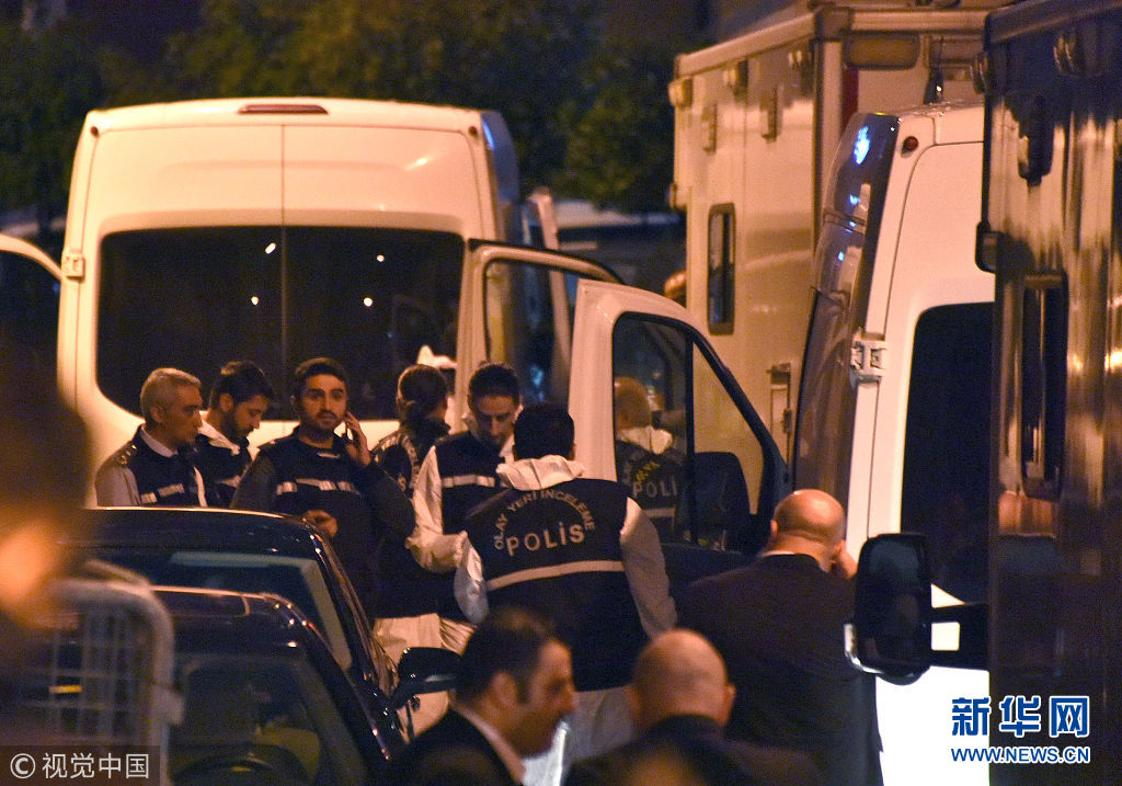 当地时间2018年10月15日,土耳其伊斯坦布尔,一个土耳其调查小组15日晚进入沙特阿拉伯驻土耳其伊斯坦布尔领事馆,就沙特记者卡舒吉“失踪”事件展开调查。 (图片来源:视觉中国)