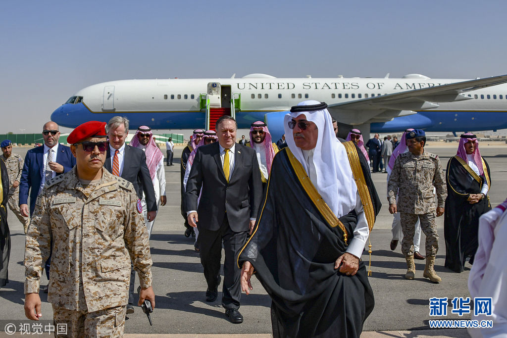 当地时间2018年10月16日,沙特利雅得,美国国务卿蓬佩奥16日抵达沙特阿拉伯首都利雅得,与沙特王储穆罕默德就沙特记者卡舒吉“失踪”事件举行会谈。 (图片来源:视觉中国)