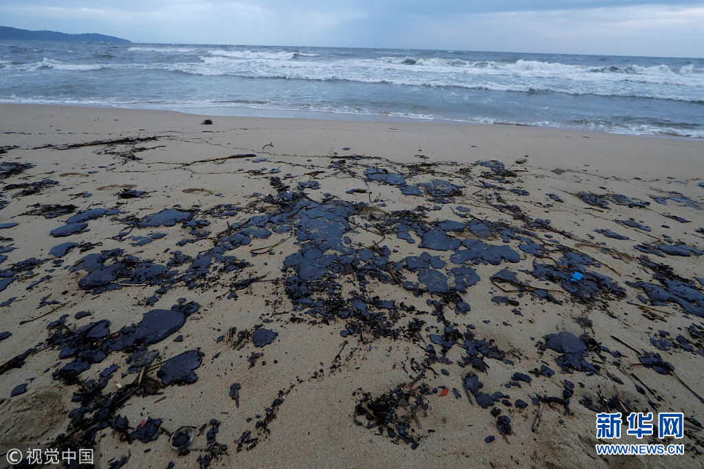 当地时间2018年10月16日,法国拉马蒂埃勒,当地的海滩上遍布黑色油迹。10月7日,一艘突尼斯籍滚装船“Ulysse”与一艘塞浦路斯集装箱船“CLS Virginia”在地中海科西嘉岛发生碰撞,出现严重的溢油事故。(图片来源:视觉中国)
