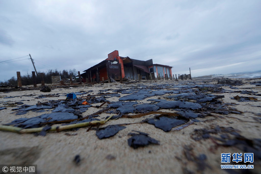 当地时间2018年10月16日,法国拉马蒂埃勒,当地的海滩上遍布黑色油迹。10月7日,一艘突尼斯籍滚装船“Ulysse”与一艘塞浦路斯集装箱船“CLS Virginia”在地中海科西嘉岛发生碰撞,出现严重的溢油事故。(图片来源:视觉中国)