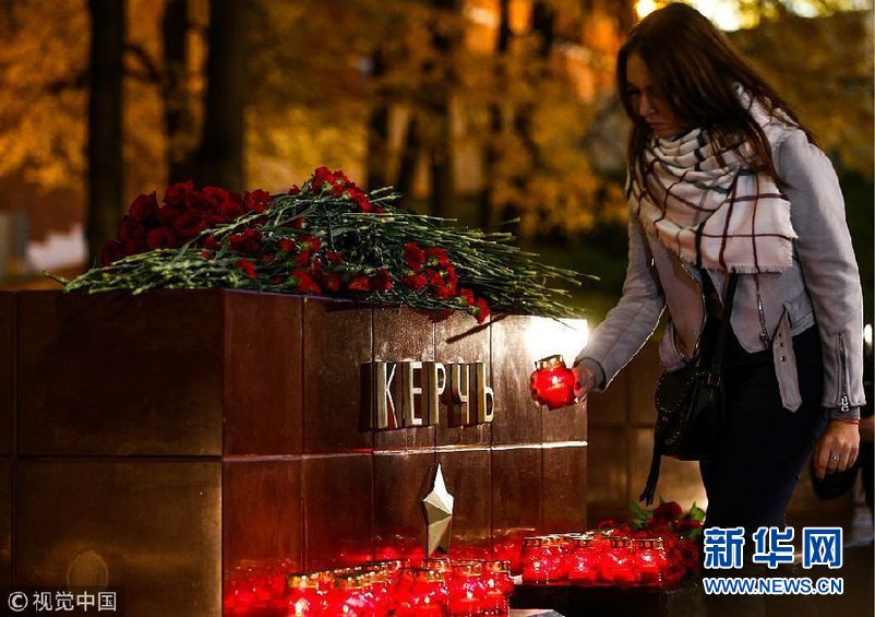 当地时间2018年10月17日,俄罗斯莫斯科,民众献花、点燃蜡烛悼念刻赤市一所理工大学爆炸事件遇难者。据报道,17日下午,克里米亚东部刻赤市一所理工大学内发生剧烈爆炸,造成多人伤亡。(图片来源:视觉中国)