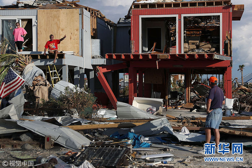 当地时间2018年10月17日,美国佛罗里达州墨西哥滩,飓风“迈克尔”过境后,当地一片废墟,善后工作持续进行。(图片来源:视觉中国)