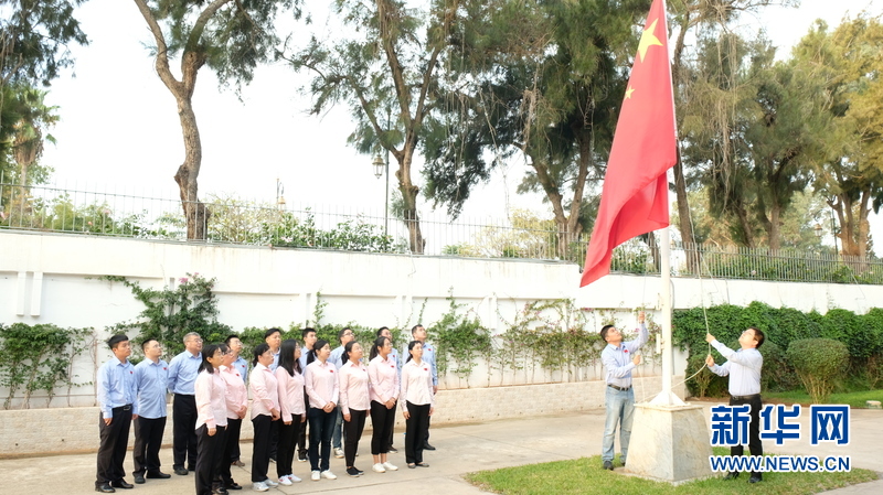 2018年10月22日,中国援摩洛哥医疗队18位新队员在位于拉巴特的中国驻摩洛哥大使馆举行升旗宣誓仪式。这些新队员将在摩洛哥承担两年的援外医疗任务。中国援摩医疗队由上海市派出,下辖8个医疗分队约80名队员,分别在穆罕默迪亚、拉希迪耶、塔扎、舍夫沙万、阿加迪尔、梅克内斯、本格里、塞达特等地区公立医院开展医疗业务,大多数是条件艰苦的偏远山区和荒漠地带。 新华社记者陈斌杰摄