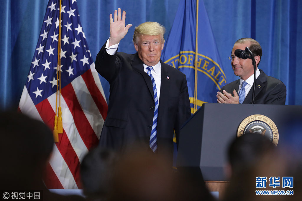 当地时间2018年10月25日,美国华盛顿,美国总统唐纳德·特朗普在华盛顿特区卫生与公众服务部就处方药价格问题发表演讲。特朗普在发表演讲时宣布了一项改革医疗保险支付药物费用的计划,提议削减医疗保险为治疗癌症和其他疾病的昂贵药物支付的费用。他声称“全球范围内的不劳而获”行为推高了药品成本,并称他的计划可以在五年内为联邦医疗保险节省170多亿美元,并使其中一些药品的成本下降达30%。(图片来源:视觉中国)