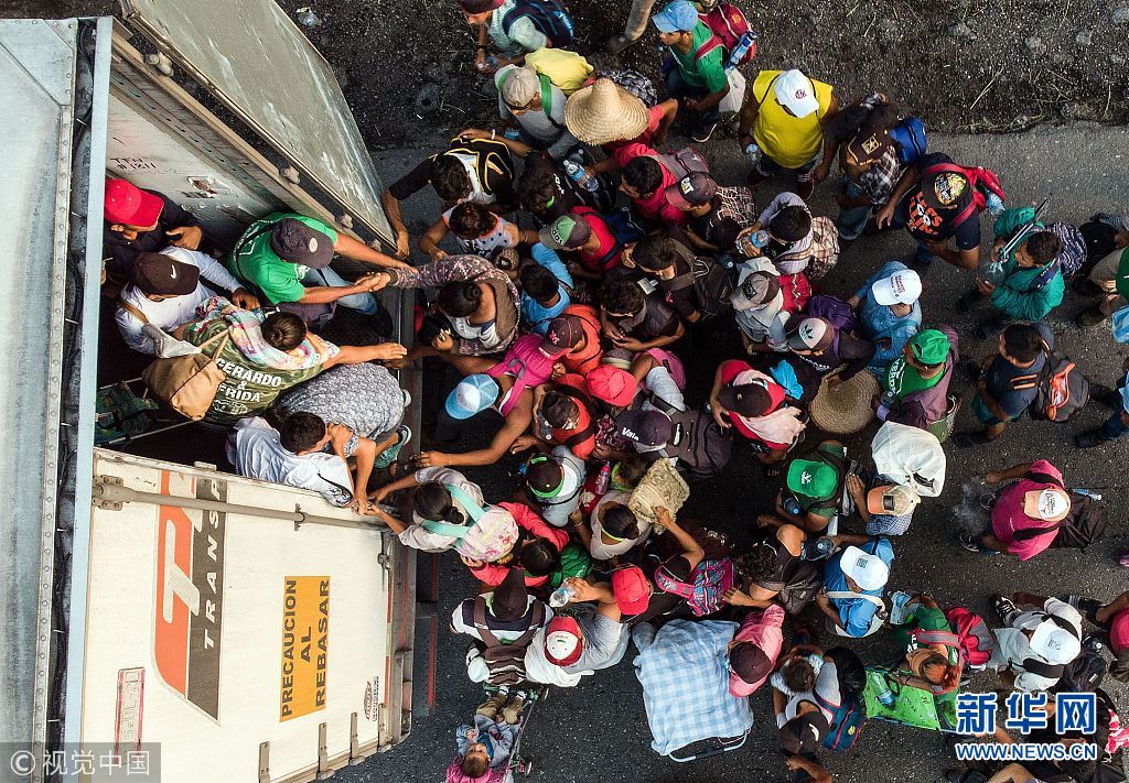 当地时间2018年10月26日,墨西哥皮吉加潘镇,中美洲移民搭乘货车前往美墨边境。