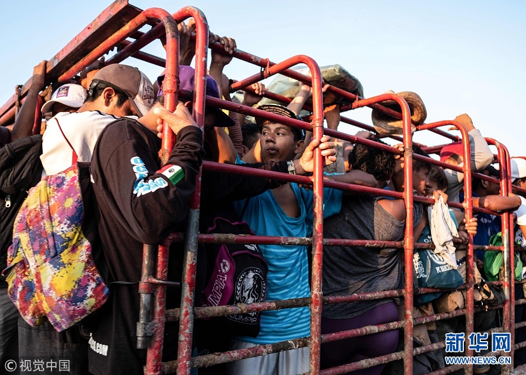 当地时间2018年10月26日,墨西哥皮吉加潘镇,中美洲移民搭乘货车前往美墨边境。