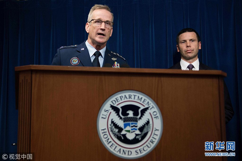 当地时间2018年10月29日,美国华盛顿,美军北方司令部司令奥肖内西、美国海关和边境保护局长凯文·麦卡利南举行记者会。奥肖内西29日宣布,美军将派遣5200名现役士兵前往南部边境,应对中美洲移民潮。近日,数千名来自洪都拉斯、危地马拉和萨尔瓦多等中美洲国家的民众穿越边界进入墨西哥。他们或步行、或乘坐大篷车北上,有意穿越墨西哥前往美国。(图片来源:视觉中国)