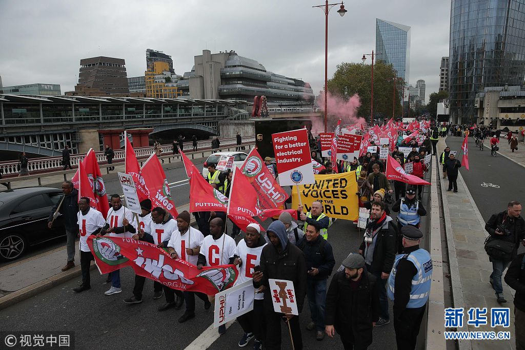 当地时间2018年10月30日,英国伦敦,包括Uber司机、快递员等数百名示威者上街游行,要求提升工人权利。 (图片来源:视觉中国)