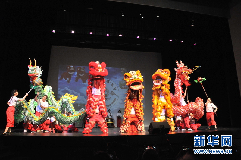 11月3日,美国休斯敦,休斯敦少林寺文化中心学生表演《龙狮欢舞》。新华社记者 刘立伟 摄