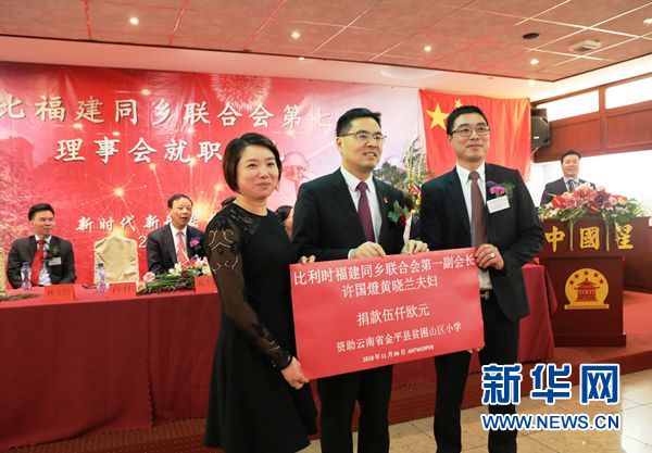 就职典礼上,比利时福建同乡联合会第七届理事会第一副会长许国燈夫妇现场捐款5000欧元,用于资助云南省金平县贫困山区小学。