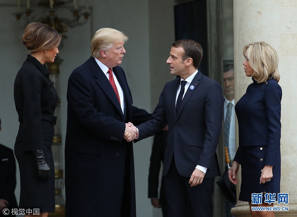 当地时间2018年11月10日,法国巴黎,美国总统特朗普夫妇抵达爱丽舍宫,与法国总统马克龙夫妇举行会晤。(图片来源:视觉中国)