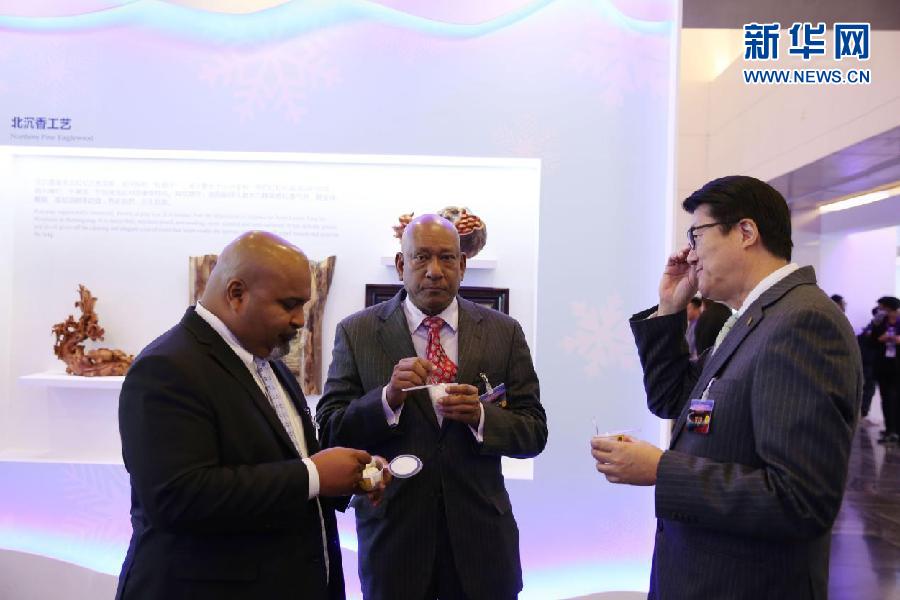 11月12日,以“新时代的中国:黑龙江 走振兴新路 约世界同行”为主题的外交部第十六场省区市全球推介活动,在外交部蓝厅举行。图为外国友人品尝黑河瓦利亚大豆冰淇淋。新华网记者 余申芳 摄