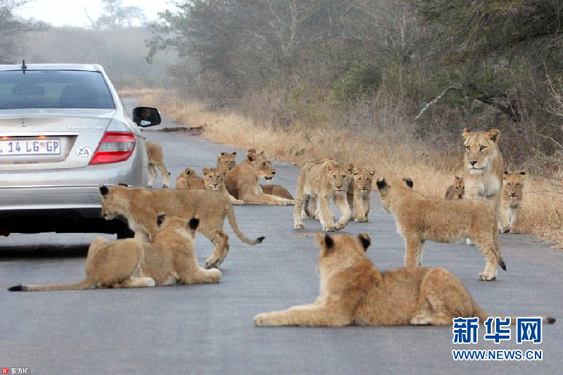 南非克鲁格国家公园,一群狮子堂而皇之地趴在马路中间休息,堵住了过往车辆的去路,让坐车经过的游客惊讶不已。显然,这群狮子看起来不仅是要当“丛林之王”还想要当这“马路之王”。 (图片来源:东方IC)