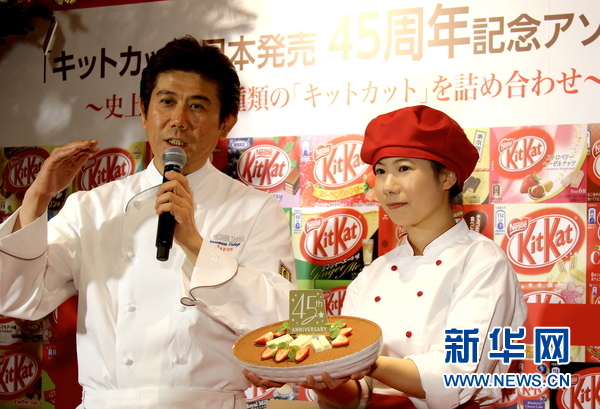 新华网东京11月15日电(记者 彭纯)雀巢日本株式会社14日在东京举办了“奇巧巧克力在日销售45周年”庆祝仪式,并公布了集合35种口味的巧克力礼盒及按照全球“奇巧”粉丝票选的最受欢迎口味制作的甜品。