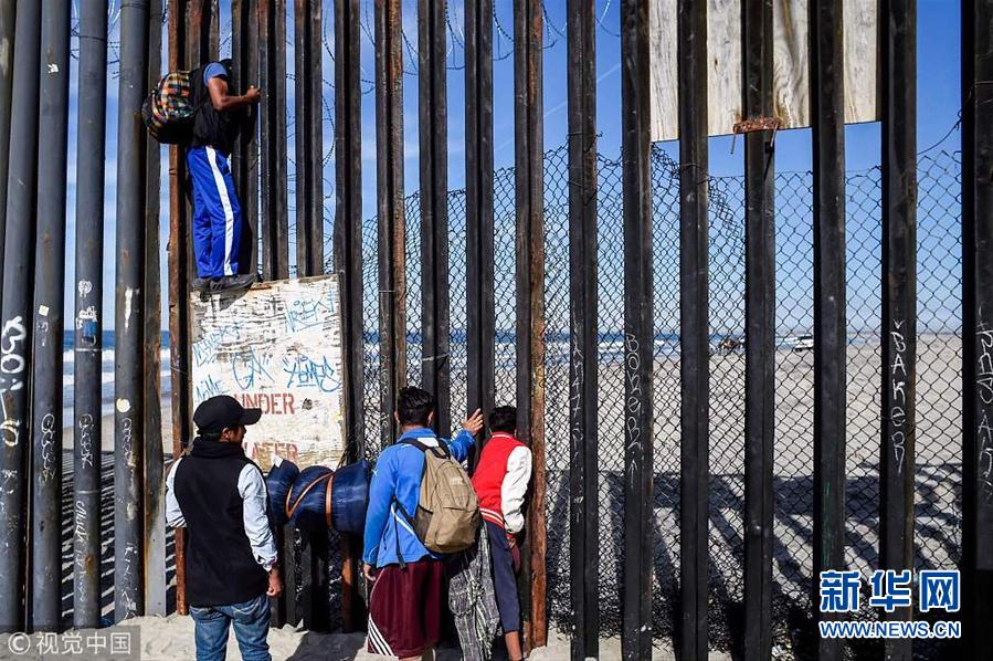 当地时间2018年11月15日,墨西哥提华纳,部分“大篷车”移民抵达美墨边境,美国士兵加高边境墙布置铁丝网防止移民入境。 (图片来源:视觉中国)