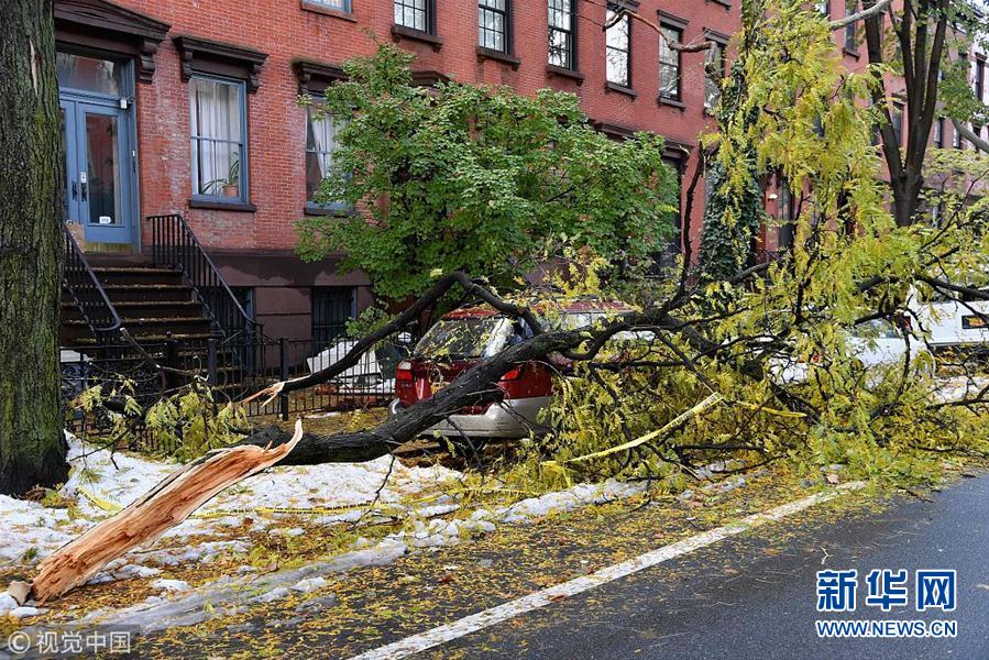 当地时间2018年11月16日,美国纽约,纽约今冬初雪雪情比预期严重,压垮路边树木。(图片来源:视觉中国)