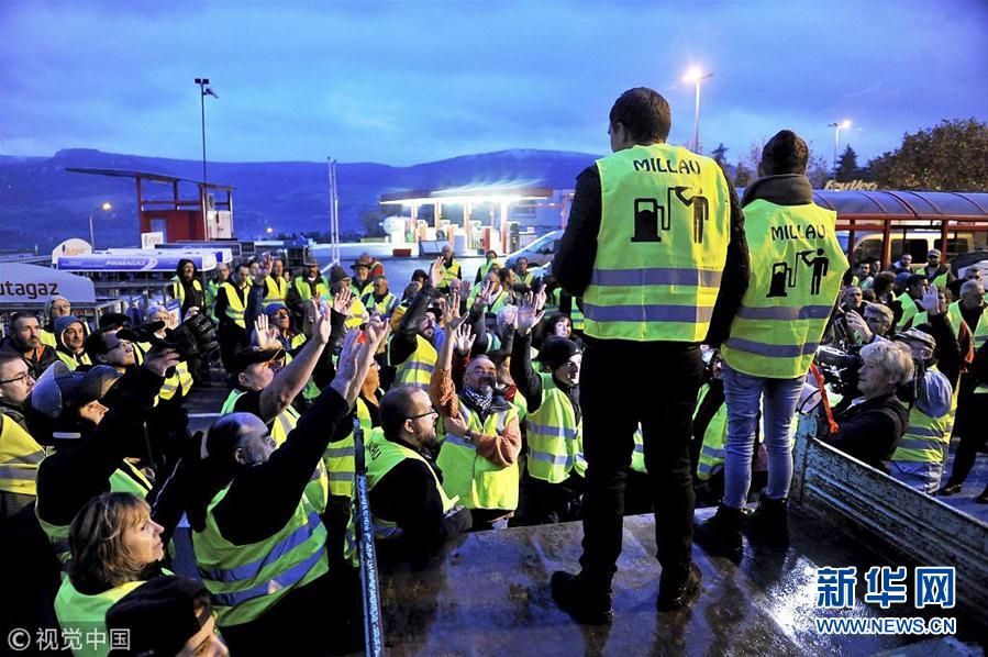 2018年11月17日,法国多地司机身穿黄色马甲在街头游行,抗议油价上涨。(图片来源:视觉中国)