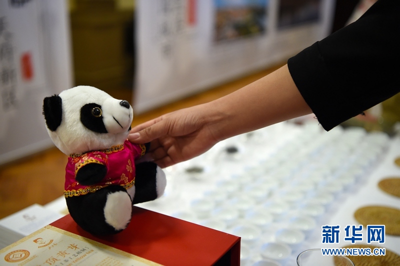 11月20日,一名嘉宾在现场摆弄一只“熊猫”玩偶。新华社记者 逯阳 摄