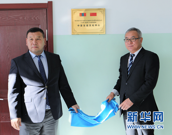 中国驻蒙古国大使馆公使衔参赞杨庆东(右)和蒙古国中央省省长巴特扎尔格勒为“中蒙友谊文化中心”揭牌。 新华社记者 阿斯钢摄