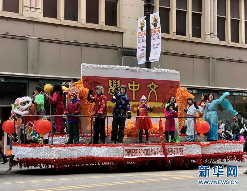 11月22日,在美国芝加哥,来自芝加哥中文学校联队的演员参加感恩节游行。新华社记者 汪平 摄