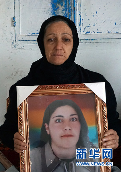 在叙利亚南部苏韦达省舍比克村,娜赫拉·阿布·阿马尔手举遇害亲人照片(11月14日摄)。新华社记者 汪健 摄
