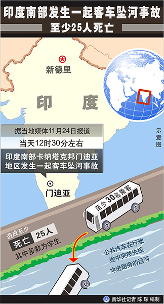 新华社新德里11月24日电(记者赵旭)印度南部卡纳塔克邦门迪亚地区24日发生一起客车坠河事故,造成至少25人死亡,其中多数为学生。