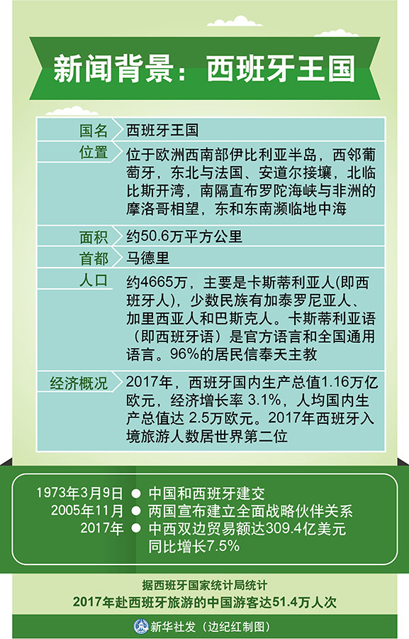 近年来,中西经贸合作持续发展。西班牙是中国在欧盟内第六大贸易伙伴,中国是西班牙在欧盟外第一大贸易伙伴。2017年,双边贸易额达309.4亿美元,同比增长7.5%。据西班牙国家统计局统计,2017年赴西班牙旅游的中国游客达51.4万人次。