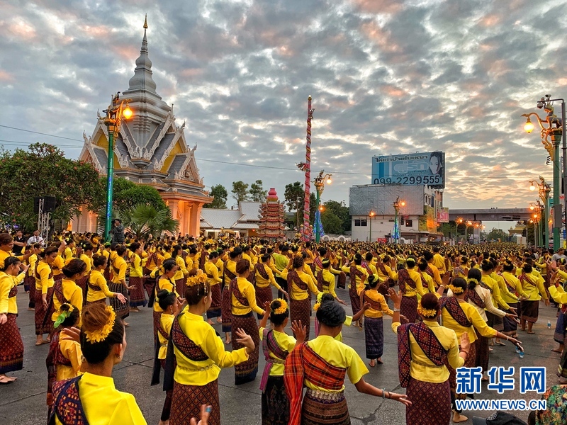 当地时间11月28日下午,泰国孔敬,近7万名以女性为主的当地民众身着传统服装在城隍庙前的几条马路上翩翩起舞,场面十分壮观。这是为庆祝泰国孔敬建城221周年,孔敬府召集来自全府各县的民众汇集在孔敬城隍庙前的马路上跳起泰国传统舞蹈。据了解,孔敬府每年都会在11月28日这一天举行集体舞蹈活动庆祝建城,以提升孔敬在旅游市场的曝光度。新华社记者杨舟摄