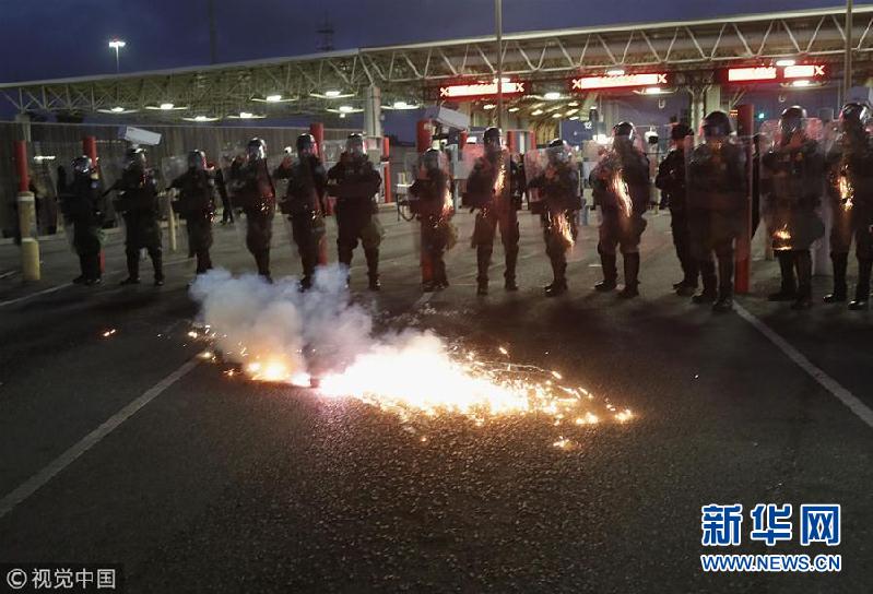 当地时间2018年12月1日,墨西哥蒂华纳,美国海关和边境保护局(CBP)官员封锁了从墨西哥进入美国的一处口岸,使用防暴装备和假催泪弹进行了人群控制训练演习,以防中美洲移民试图强行冲过边境。(图片来源:视觉中国)