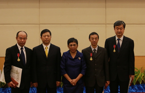 柬埔寨文化与艺术大臣彭萨格娜(中)、中国国家文物局副局长胡冰(左二)与中国文化遗产研究院三位获奖者许言(左一)、王元林(右二)、顾军(右一)合影。(图片由中国国家文物局供图)