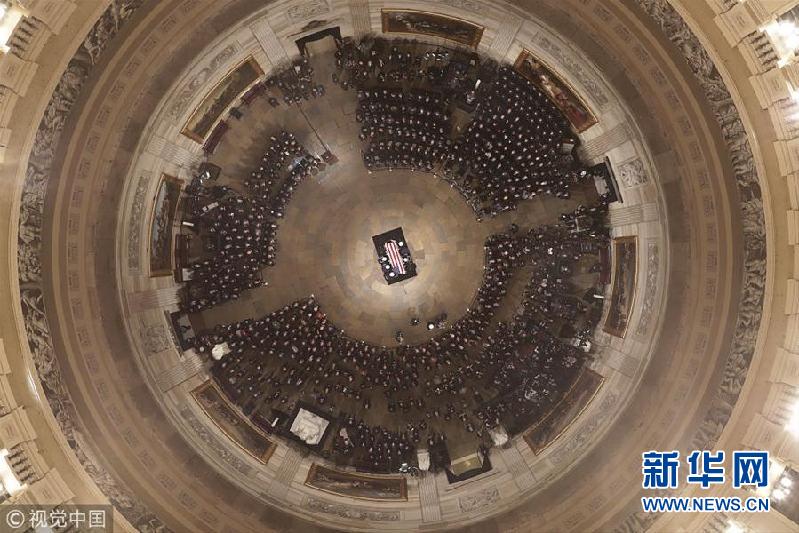 当地时间2018年12月3日,美国前总统老布什的的灵柩被运至华盛顿,陈放在美国国会的圆形大厅。(图片来源:视觉中国)