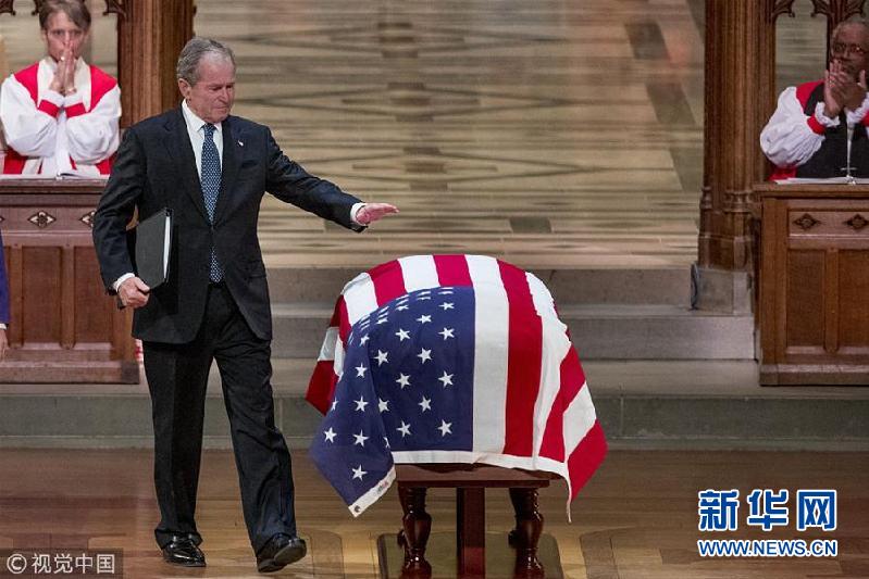 当地时间2018年12月5日,美国华盛顿,美国在华盛顿国家大教堂为已故前总统老布什举行国葬仪式。前总统小布什出席致悼词,轻抚父亲灵柩。当天,布什家族成员、现任总统特朗普、前总统奥巴马等美国政界人士以及多名国际政要出席老布什国葬仪式,为其送行。仪式结束后,老布什的灵柩将送回休斯敦安葬在家族墓地,落叶归根。(图片来源:视觉中国)