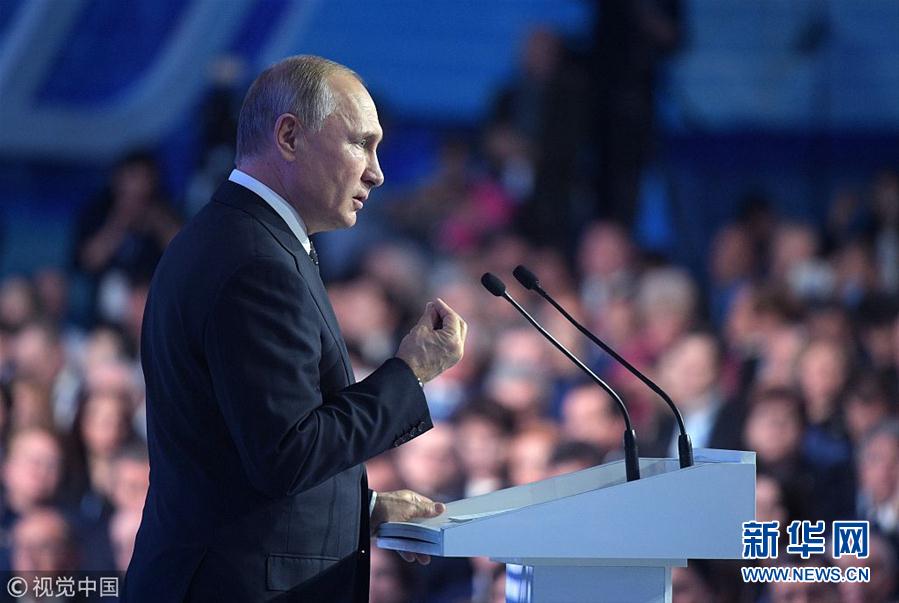 当地时间2018年12月8日,俄罗斯莫斯科,俄罗斯执政党“统一俄罗斯党”年度会议举行,俄罗斯总统普京和总理梅德韦杰夫出席会议。(图片来源:视觉中国)