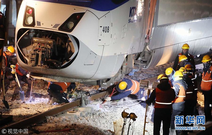 韩国铁道公社派出起重机等设备清理列车脱轨事故现场