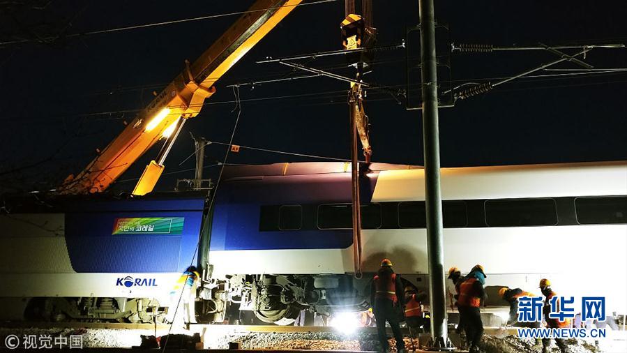 当地时间2018年12月9日,韩国江原道江陵市,韩国铁道公社派出起重机等设备清理列车脱轨事故现场。8日上午,从江陵站开往首尔站的高铁列车出发5分钟后发生脱轨事故,有14名乘客受伤。(图片来源:视觉中国)