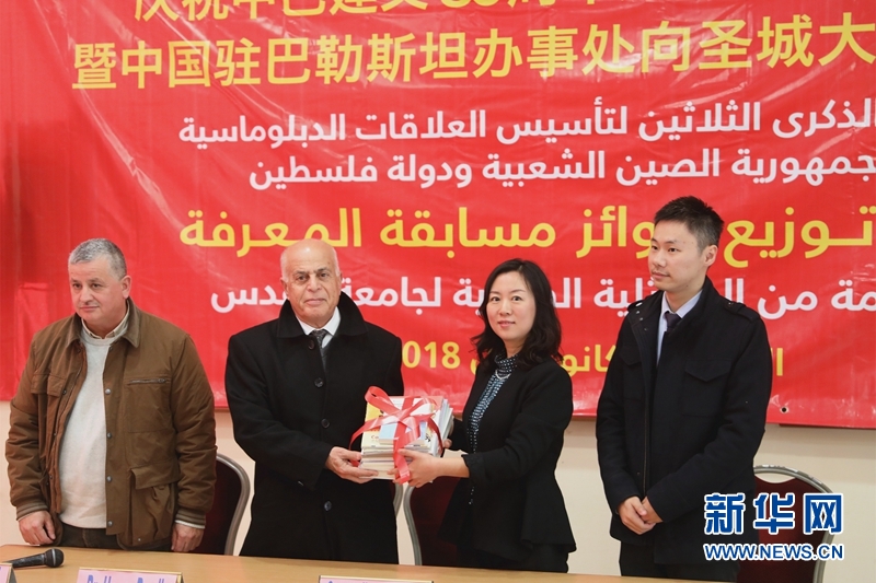 12月8日,耶路撒冷圣城大学举行庆祝中巴建交30周年知识竞赛颁奖仪式暨中国驻巴勒斯坦办事处向圣城大学捐书仪式,中国驻巴勒斯坦办事处临时代办金英(右二)向圣城大学校方代表捐赠10套中文图书。新华社记者 赵悦 摄