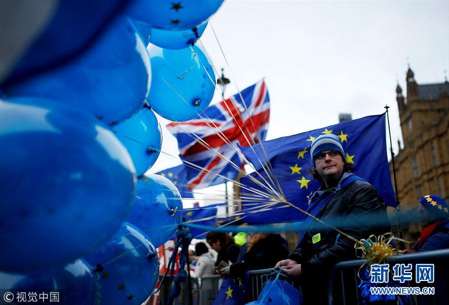 当地时间2018年12月10日,英国伦敦,反对英国“脱欧”的抗议者在议会大厦外示威。据信,因为在议会几天的辩论中遭受巨大阻力,英国首相特雷莎·梅于当地时间10日上午决定,推迟原定于11日举行的“脱欧”草案议会投票,以避免可能遭受的灾难性否决。议会投票时间将另行确定。(图片来源:视觉中国)