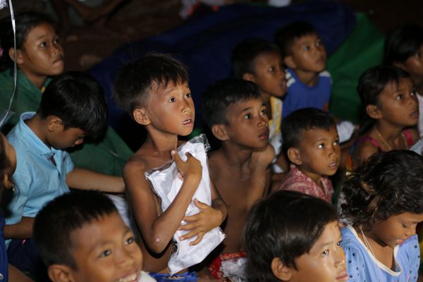 图为柬埔寨儿童在观看电影。新华网发(图片由中柬友谊台提供)